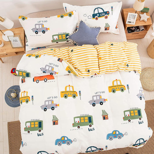 Juego de funda de duvet con estampado de camiones reversible con cuadros amarillos 100% algodón