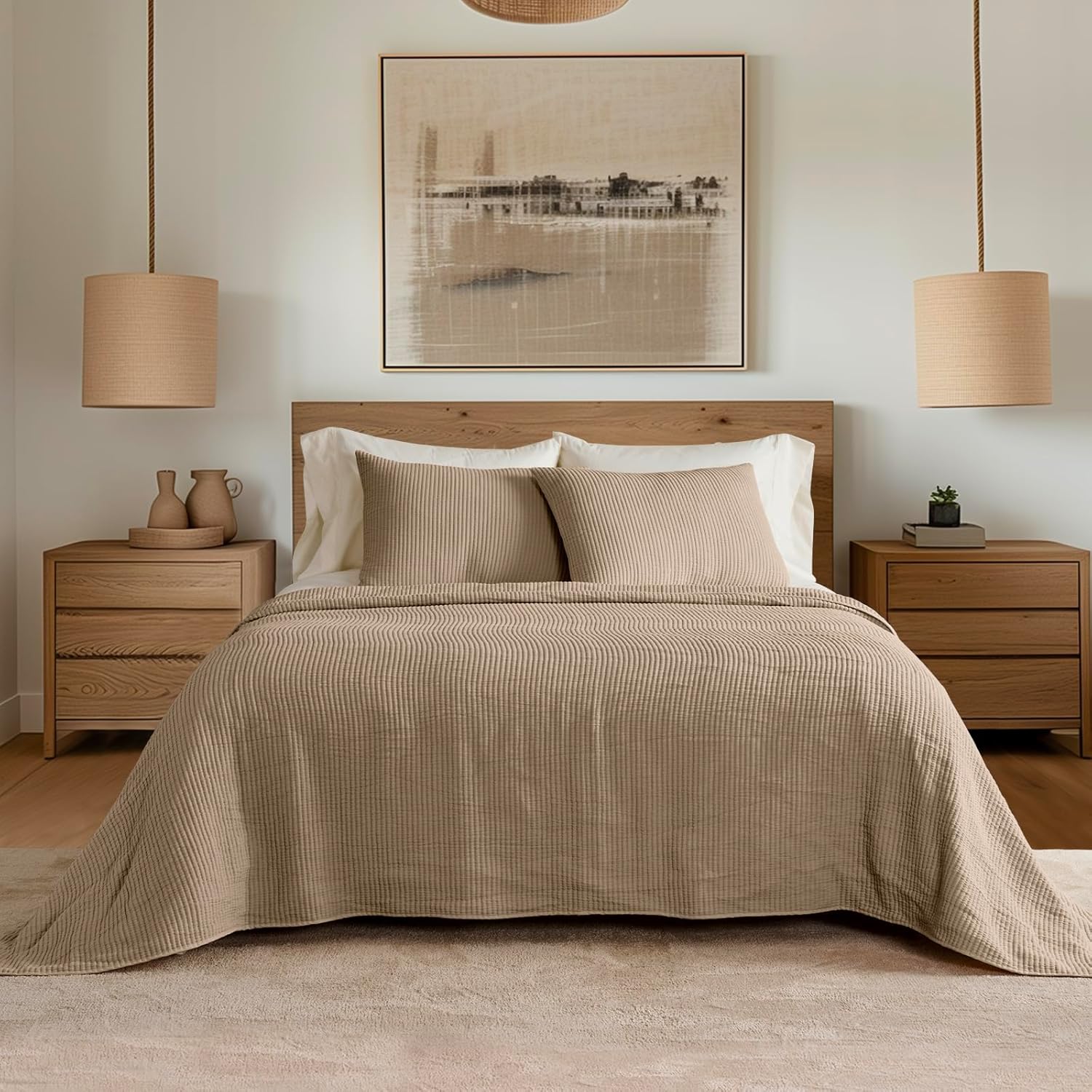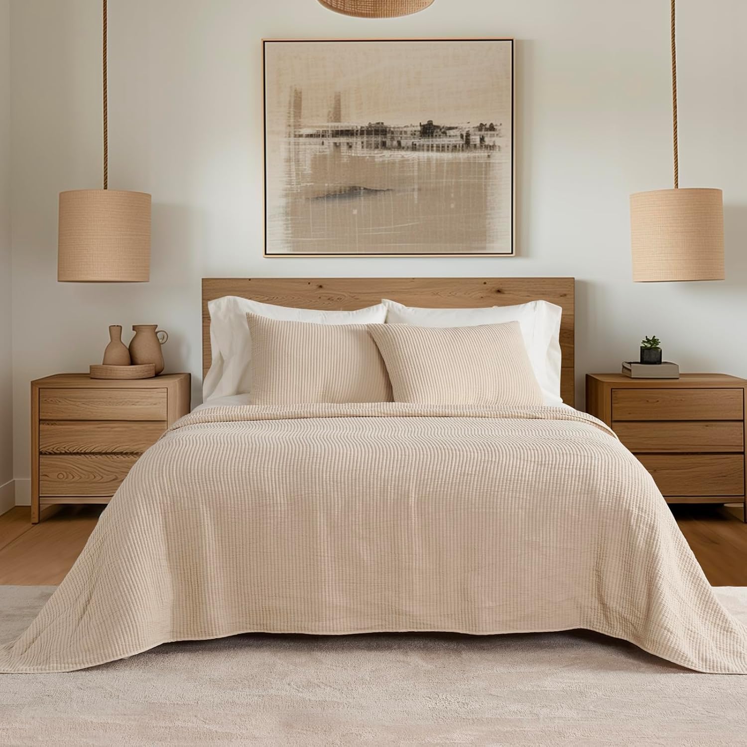 Nuestra colcha de algodón presenta una tela prelavada en ambos lados, ofreciendo una sensación suave y agradable al tacto. El tejido de algodón es ligero y transpirable, manteniéndote cálido sin sobrecalentarte, permitiendo un descanso placentero durante todo el año.