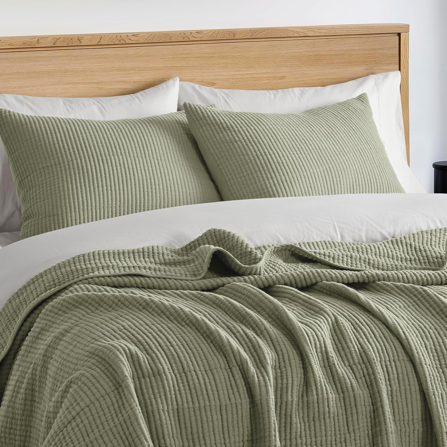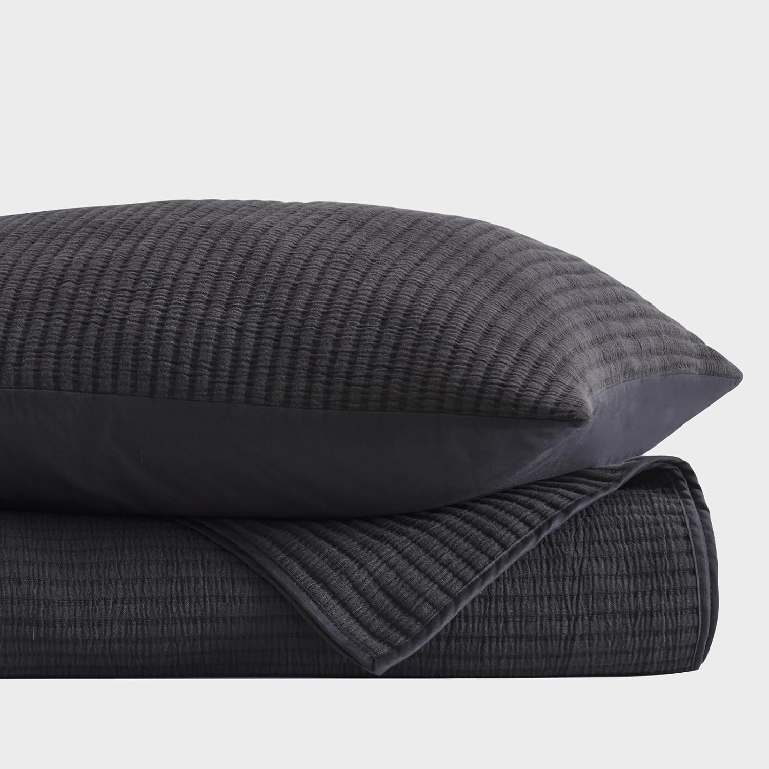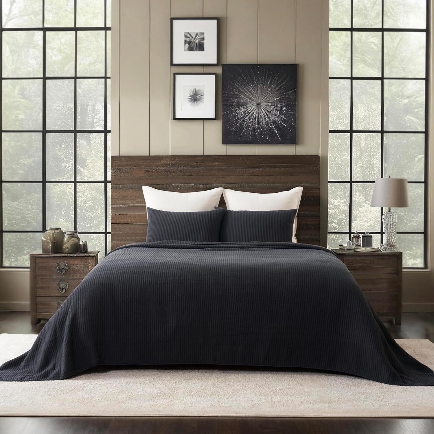 - King: Incluye una colcha de algodón (274 x 249 cm) y dos fundas de almohada a juego (51 x 91 cm).
