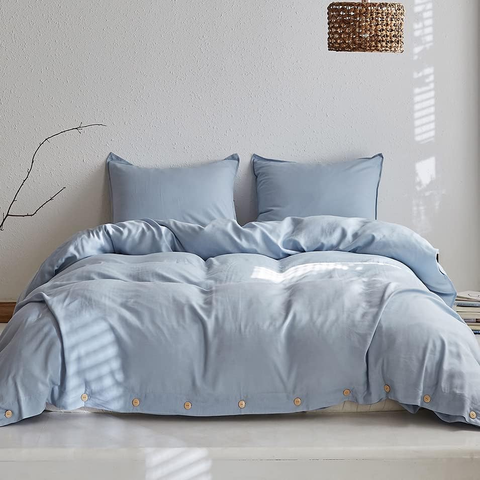 El juego de funda de duvet Brisa de Lino está confeccionado con una lujosa mezcla de lyocell (80%) y lino (20%), ideal para quienes buscan una textura fresca, suave y duradera. Su diseño atemporal con botones de madera natural y costuras reforzadas lo hace perfecto para uso diario y para quienes valoran tanto el estilo como la funcionalidad.